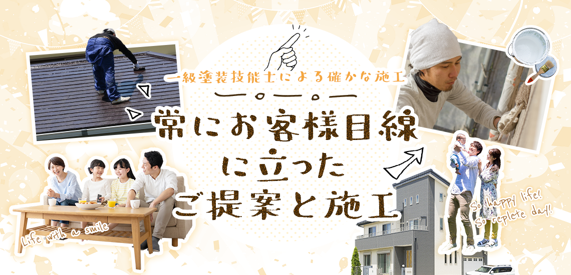 住まいの外壁や屋根に劣化の症状がみられる場合はすぐにご相談ください。私どもに期待してご依頼いただいたお客様の想いに全力でお応えするため、常にお客様目線でご提案・施工いたします。
